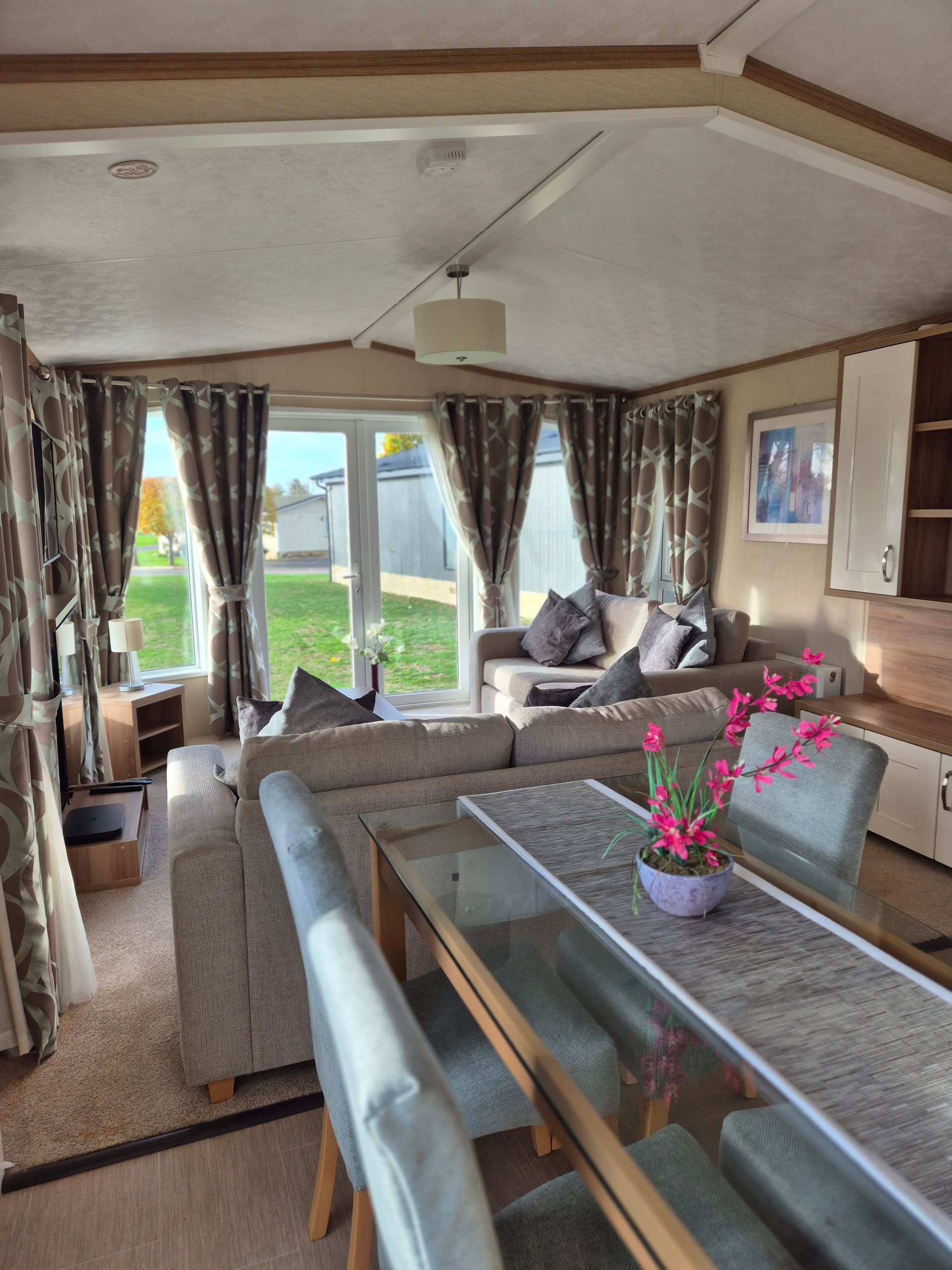 Preloved Holiday lodge With open plan living, dining & kitchen. Ideal for entertaining guests, with a shut off door to access 2 bedrooms and family bathroom